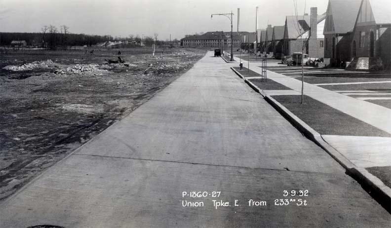 Here’s a look at Union Turnpike looking east from 233rd Street in Hollis Hills in 1932. Besides the work of intrepid photographers and chroniclers Percy Loomis Sperr and Eugene Armbruster (both of whom I’d humbly like to be compared to) in the early 20th Century, we also have to thank various street paving companies for views of New York City that don’t involve heavily chronicled landmarks, amusement and beach areas typically found in postcards.